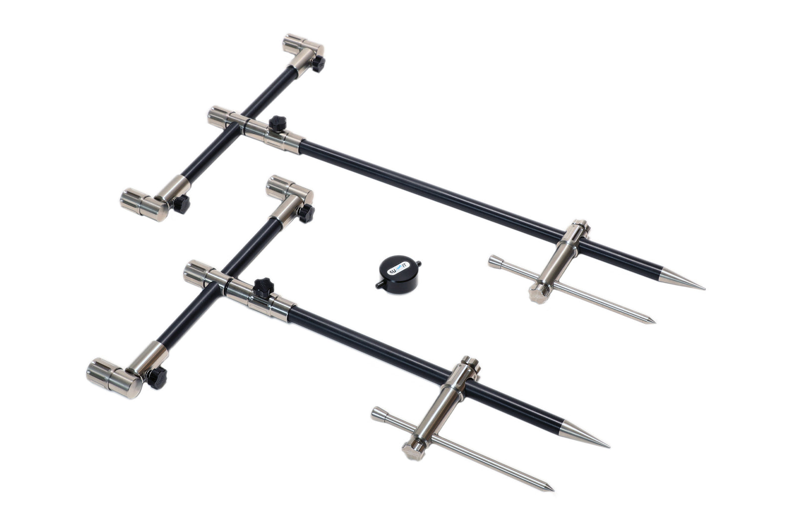 Our Black Edition 3-Rod Adjustable Buzz Bar Kit (Thumbscrew) has everything you need included for rock solid bankware set-up straight out of the bag. With 3-Rod adjustable front and rear Buzz Bars with the 10” front buzz bars extending to 16” when open and 9” back Buzz Bars that extend to 15” when open perfect for if you are using big pit reels. These screw into the 16” and 12” Colosseum Banksticks included and boast the distinctive Summit Colosseum fluted design with an ergonomic thumb screw teamed with a cleverly engineered inner section to ensure zero-twist and a solid hold when adjusting height. The robust solid Stainless Steel points effortlessly penetrate even the toughest of grounds.