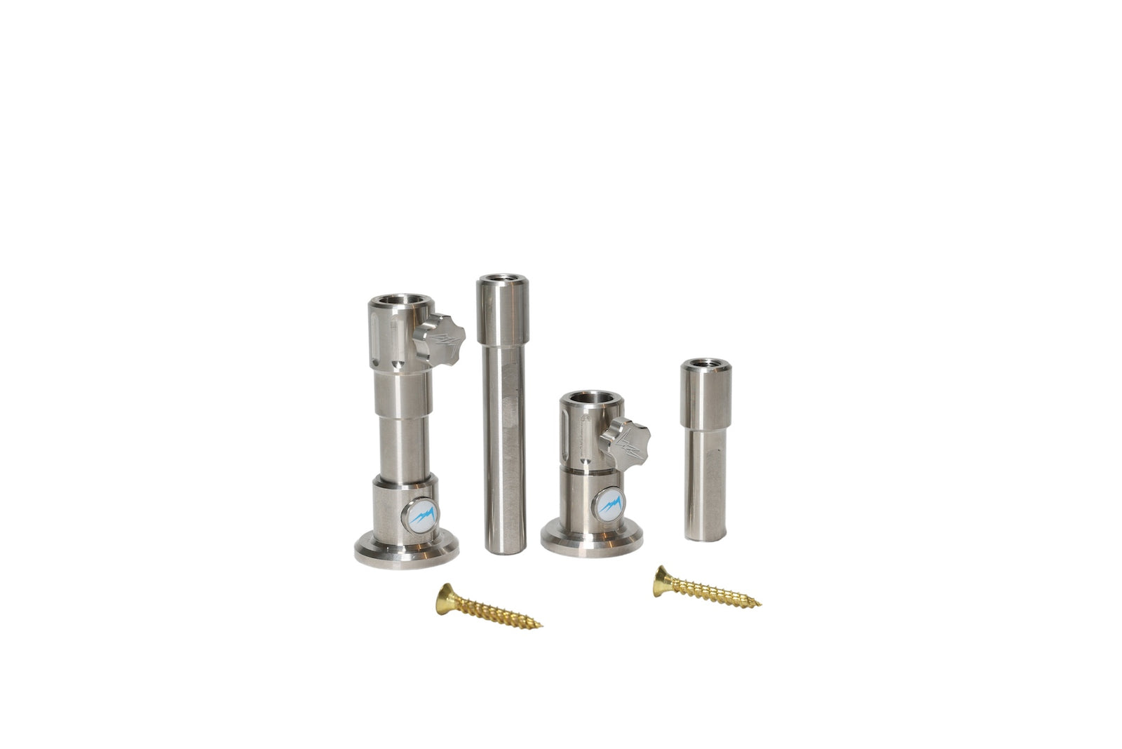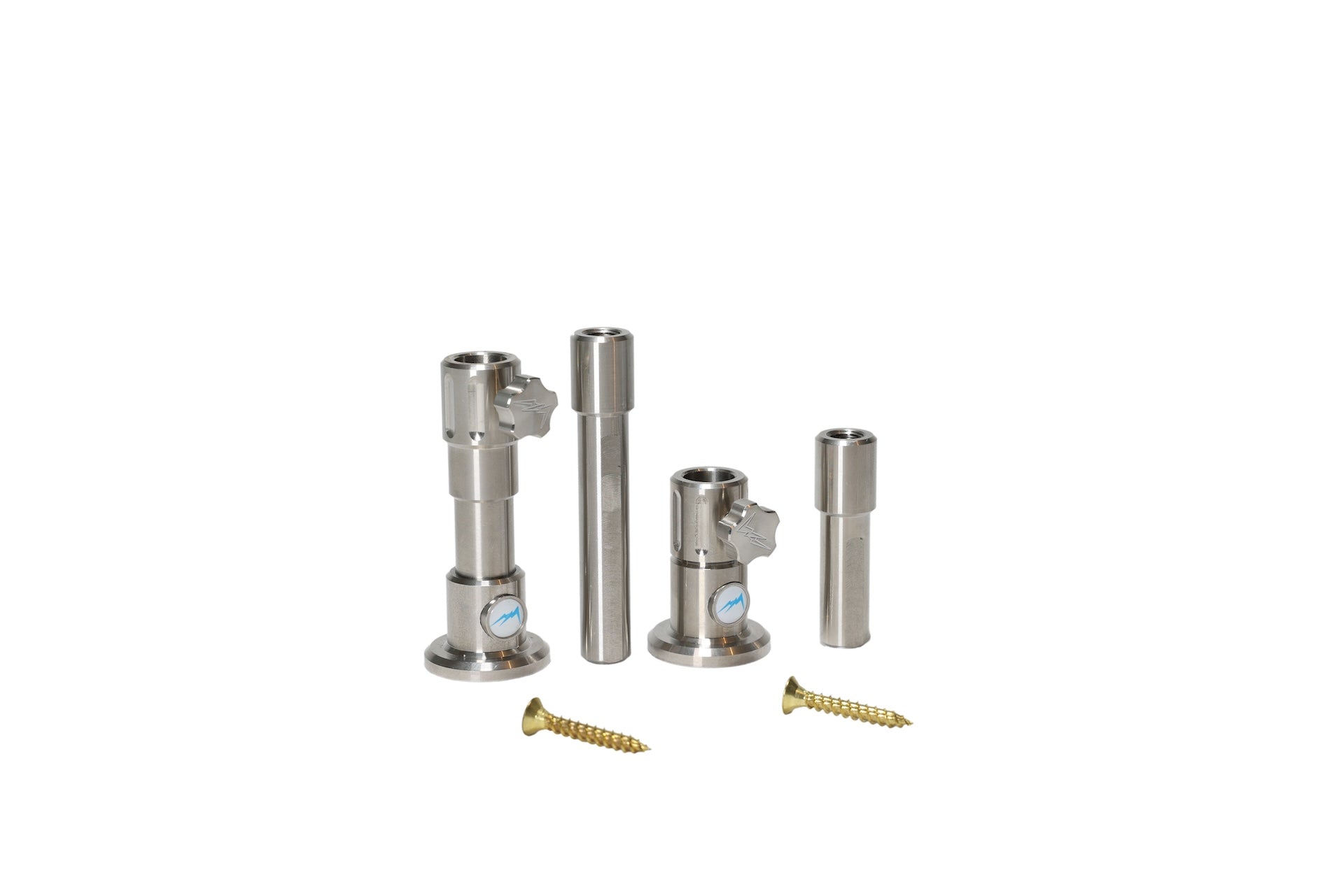 Our Colosseum Stage Stand Kit comes with a standard and mini stage stand to provide a sturdy base for your bank stick set-up when fishing platforms or sleeper edged swims. Made from high grade stainless steel for supreme strength and ultimate durability. Simply screw your stage stand into your platform with the specially hardened screws provided, screw the buzz bar onto the bank stick inner and insert your bank stick into the stand. It also features a serrated base that bites into the platform for ultimate stability and thumb screws that can be locked in solid with our Easy-Tight key. The Colosseum Stage Stand Kit is compatible with our entire Stainless & aluminum/stainless range.